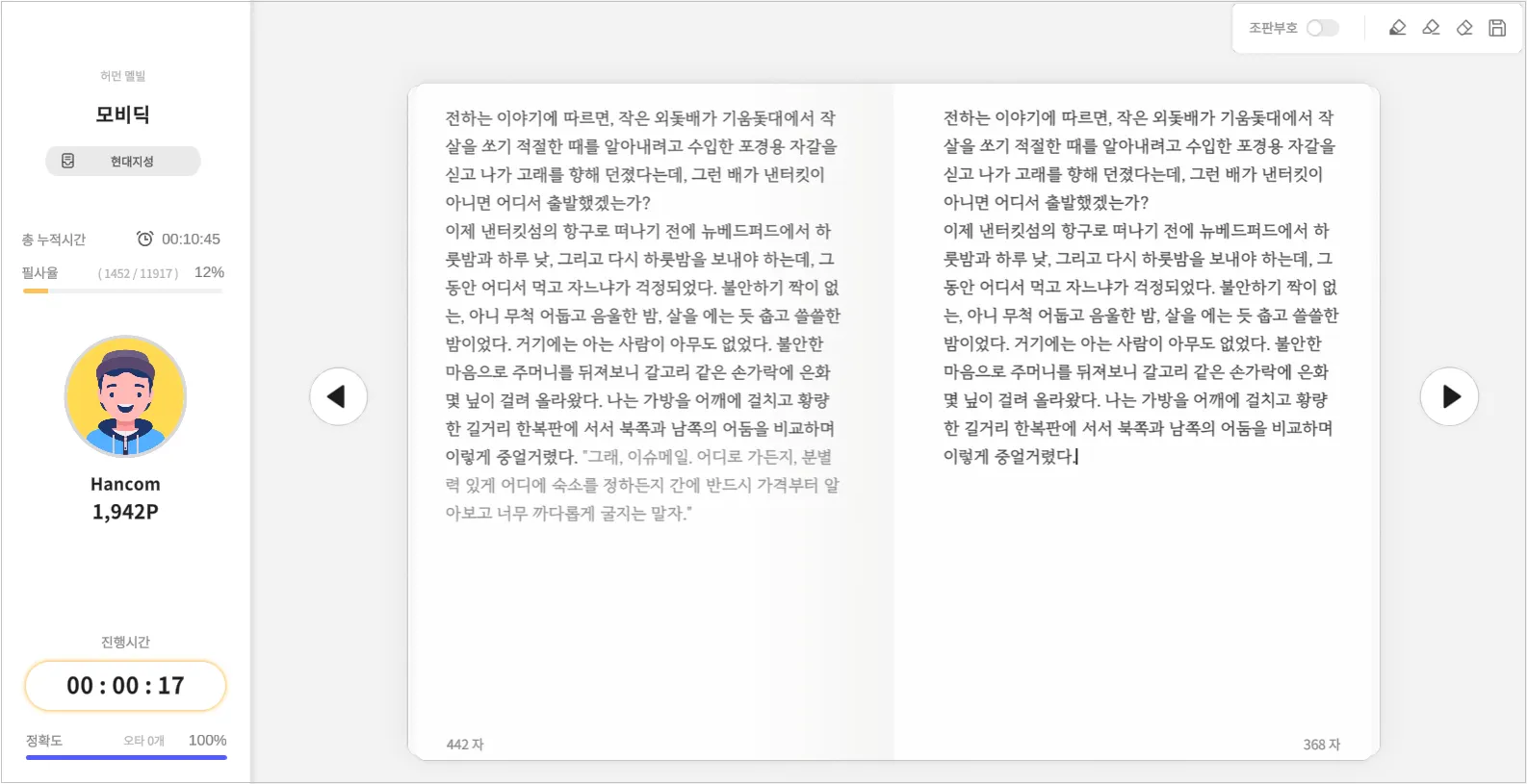 지금 한컴타자에서 ‘모비 딕’을 필사해 보세요. 한컴타자에서 한 문장씩 음미하면서 필사하고 마음에 드는 내용은 ‘독서노트’에 저장하세요.