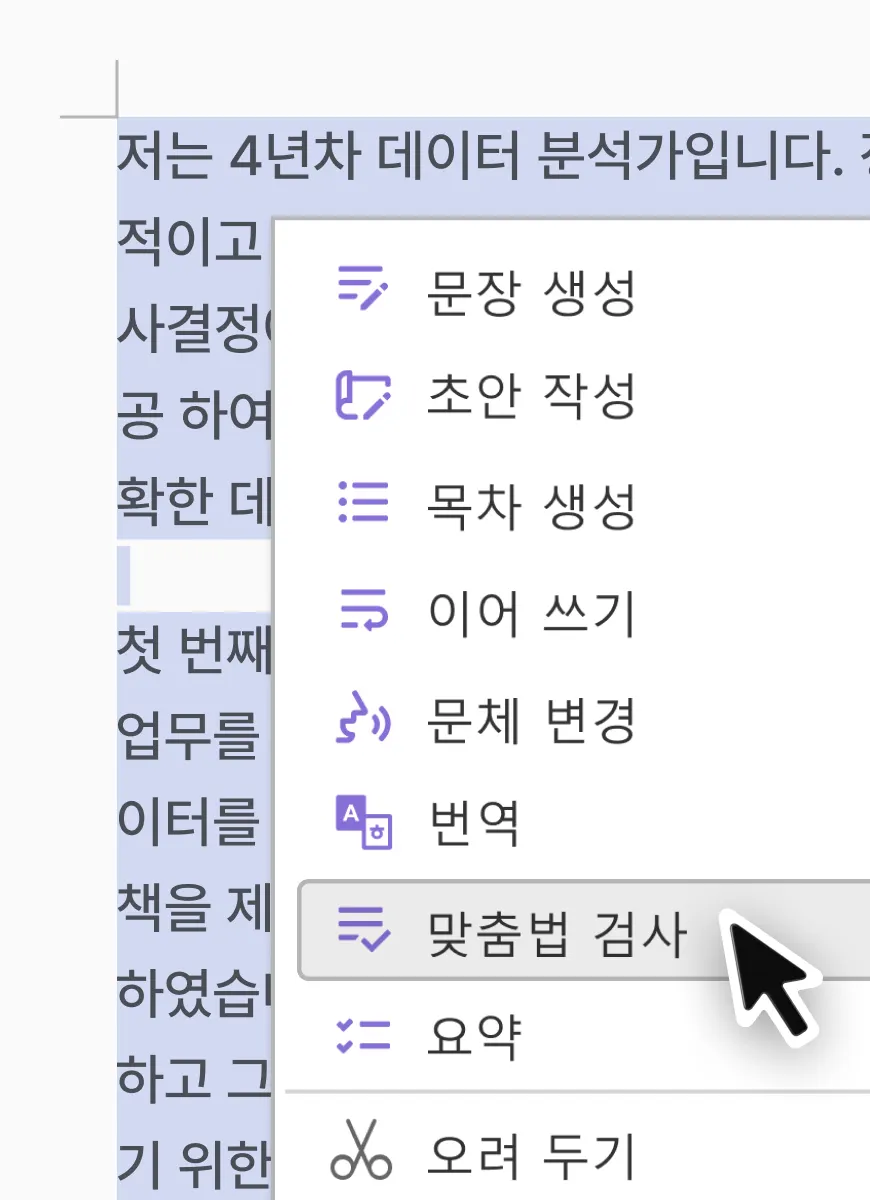 아래 3가지 방법으로 한컴독스 AI를 이용해 맞춤법 기능을 이용할 수 있습니다.