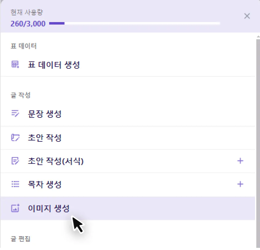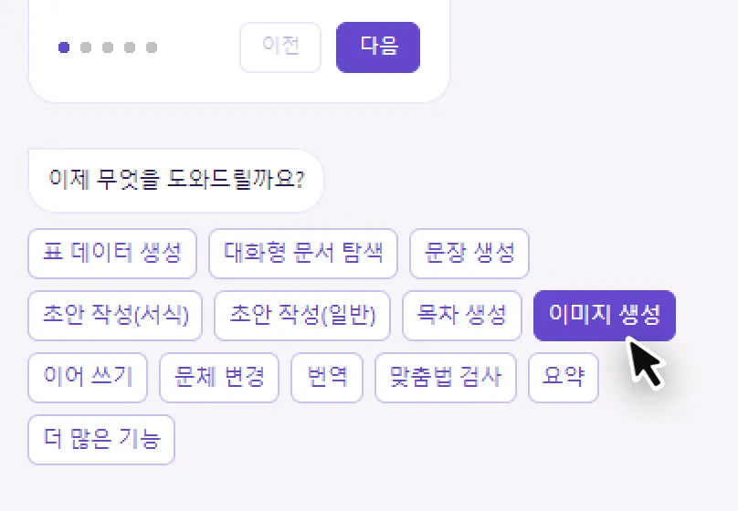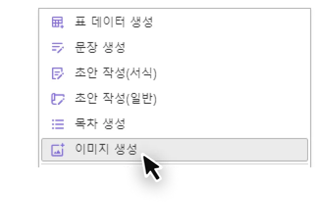아래 3가지 방법으로 한컴독스 AI를 이용해 이미지 생성 기능을 이용할 수 있습니다.