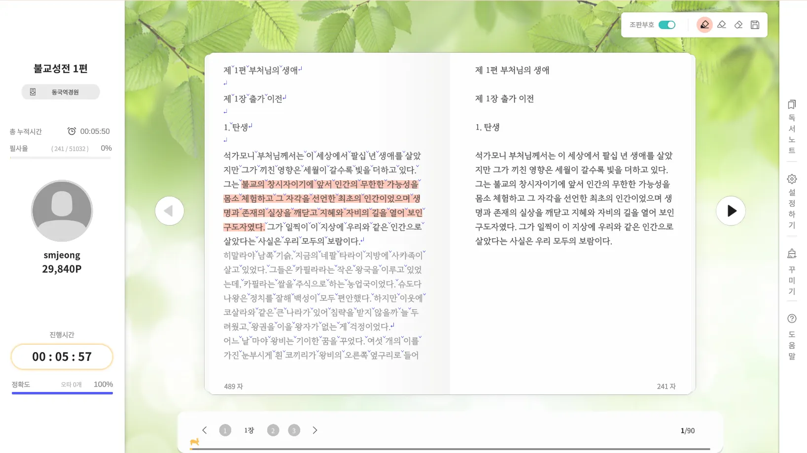 석가모니 부처님의 탄생부터 천천히 필사해 보세요. 형광펜으로 내용을 표시하고 독서 노트에 저장할 수 있어요.