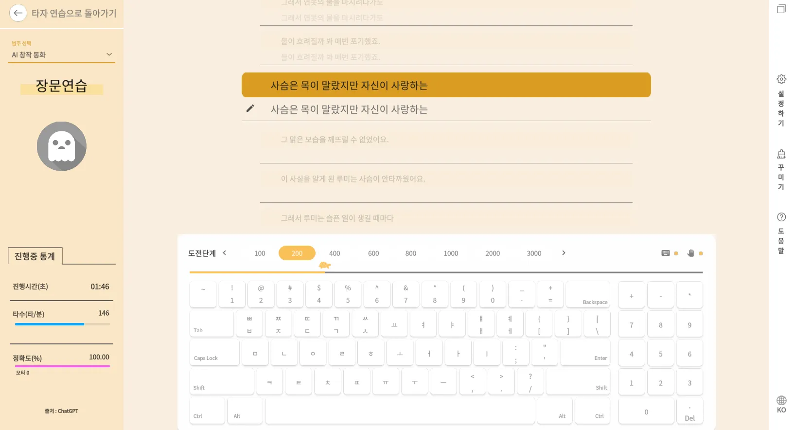 타자 연습 > 장문 연습에서 범주를 ‘AI 창작 동화’로 선택해 주세요.