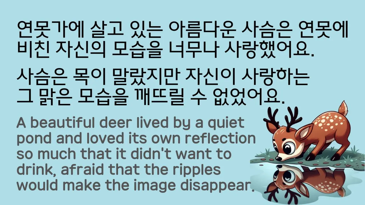 사슴은 목이 말랐지만 자신이 사랑하는 그 맑은 모습을 깨뜨릴 수 없었어요.
