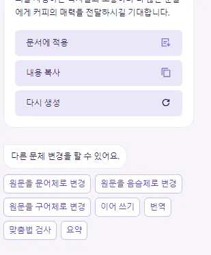 생성된 문장에 대해 문서에 적용/내용 복사/다시 생성하기가 가능합니다.