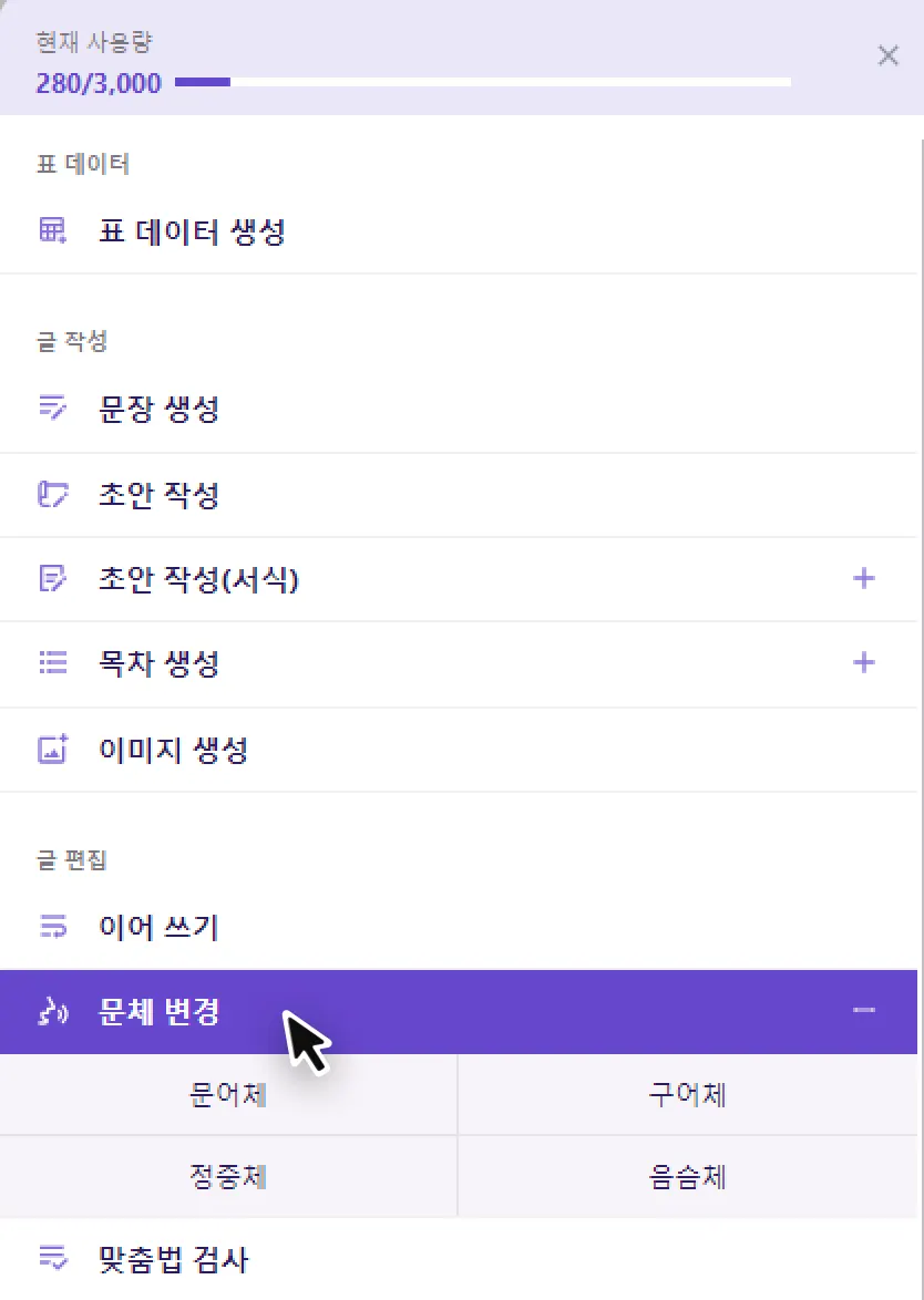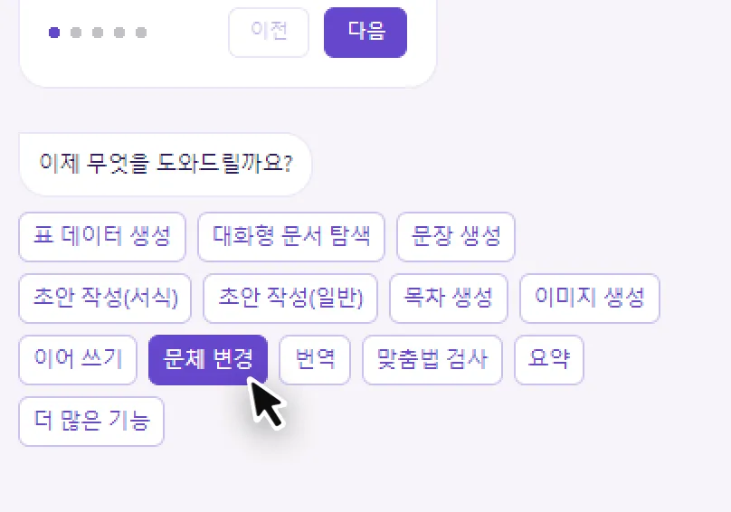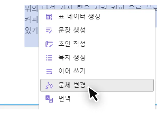 아래 3가지 방법으로 한컴독스 AI를 이용해 문체 변경 기능을 이용할 수 있습니다.