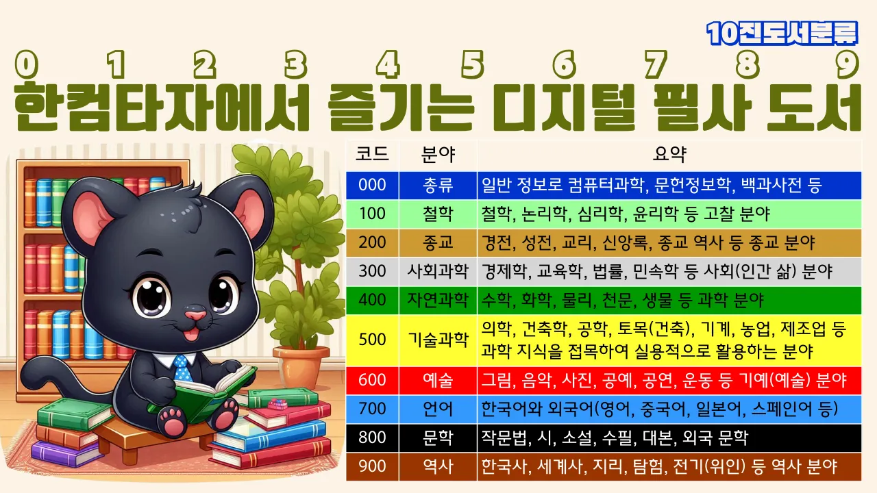 도서를10개 분야로 분류하고 0에서 9까지의 숫자를 활용해서 큰 단위로 관리하는 방법이에요.