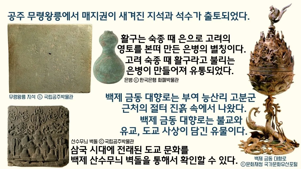 백제 금동 대향로는 불교와 유교, 도교 사상이 담긴 유물이다.