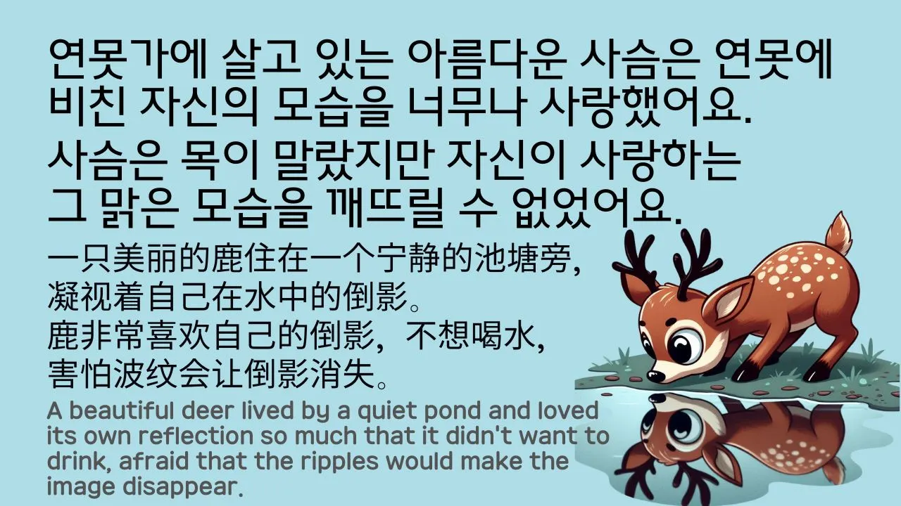 A beautiful deer lived by a pond and loved its own reflection so much that it didn't want to drink, afraid that the ripples would make the image disappear.