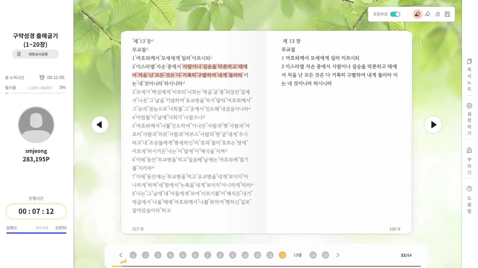 한컴타자에서 출애굽기를 디지털 필사하고, 마음을 울리는 내용은 형광펜으로 표시하세요