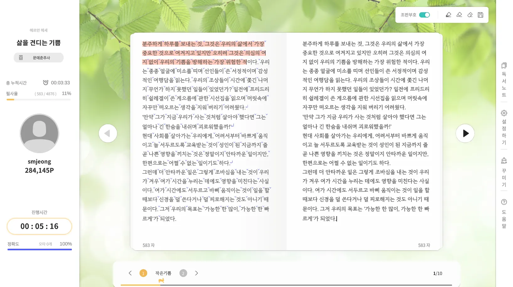 천천히 디지털 필사하면서 울림을 주는 내용은 형광펜으로 표시해요.
