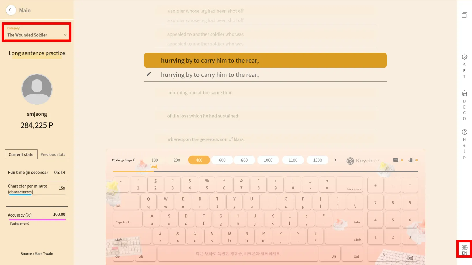 ※ 타자 연습에서 키보드 언어를 변경할 수 있고, 영어로 설정하면 QWERTY와 DVORAK 키보드로 연습할 수 있어요