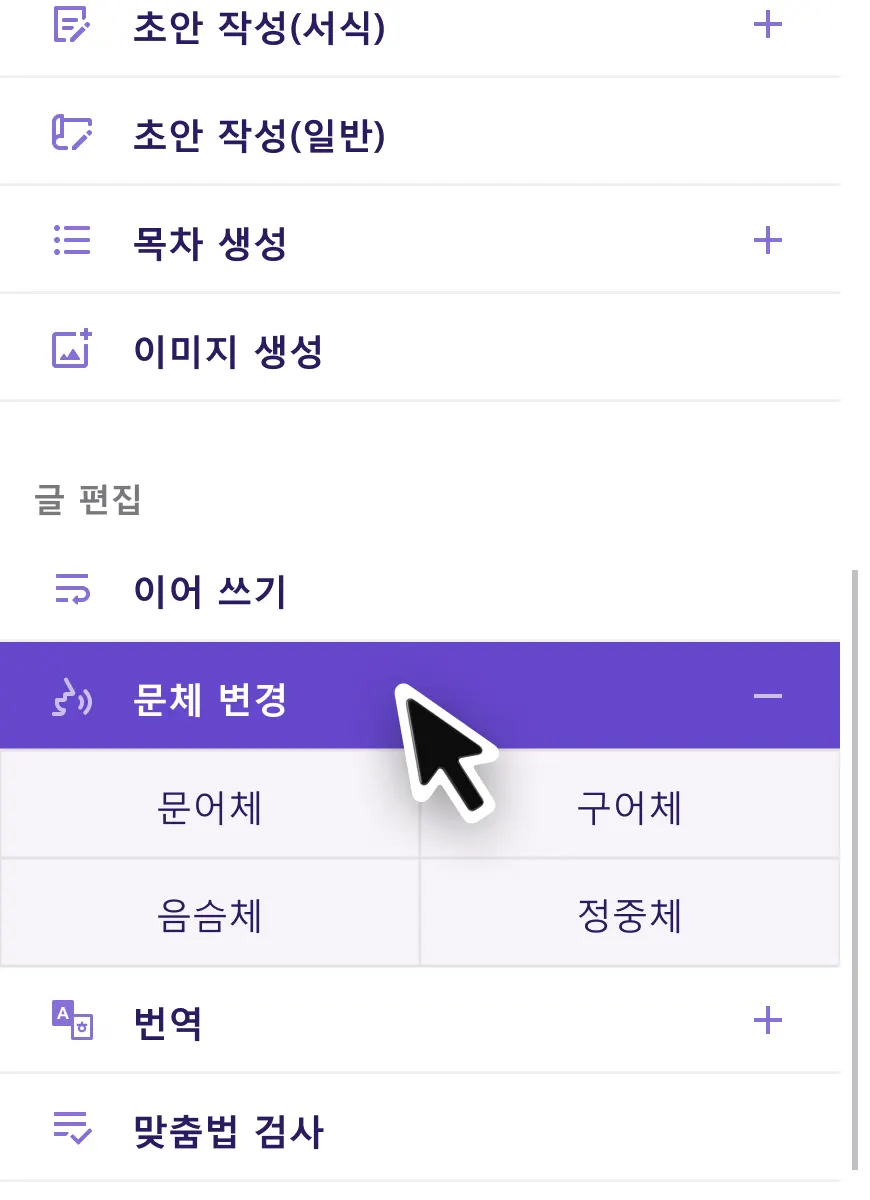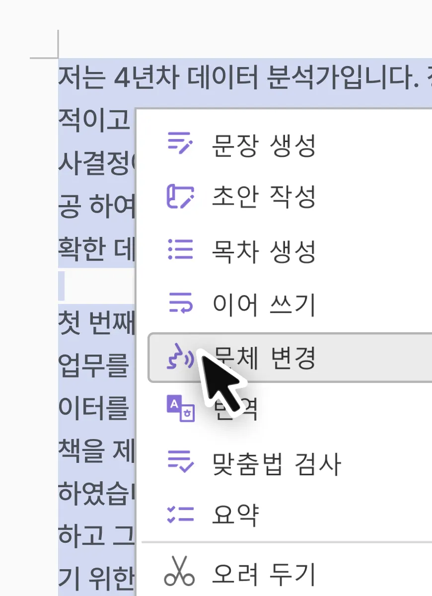 아래 3가지 방법으로 한컴독스 AI를 이용해 문체 변경 기능을 이용할 수 있습니다.