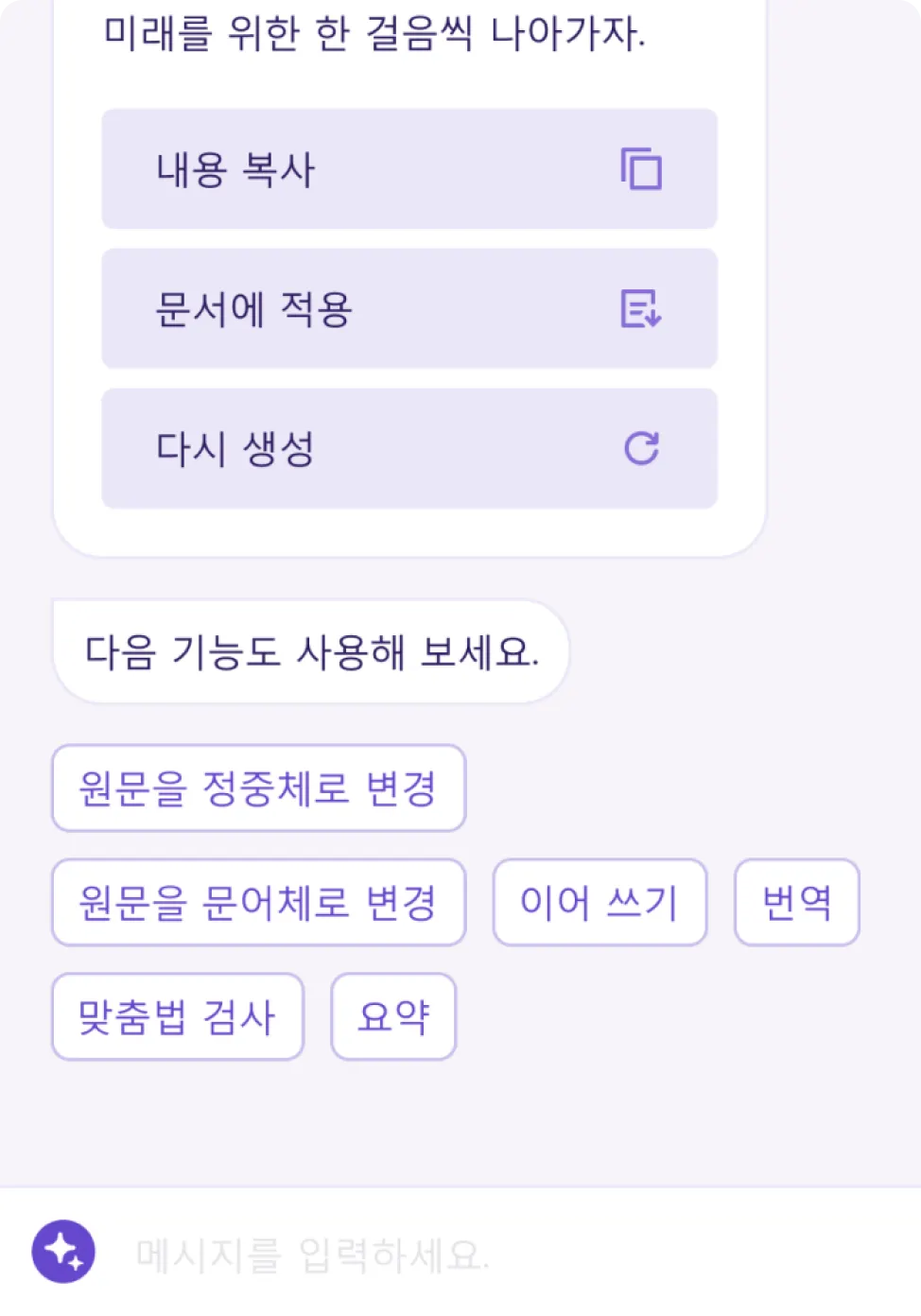 생성된 문장에 대해 문서에 적용/내용 복사/다시 생성하기가 가능합니다.