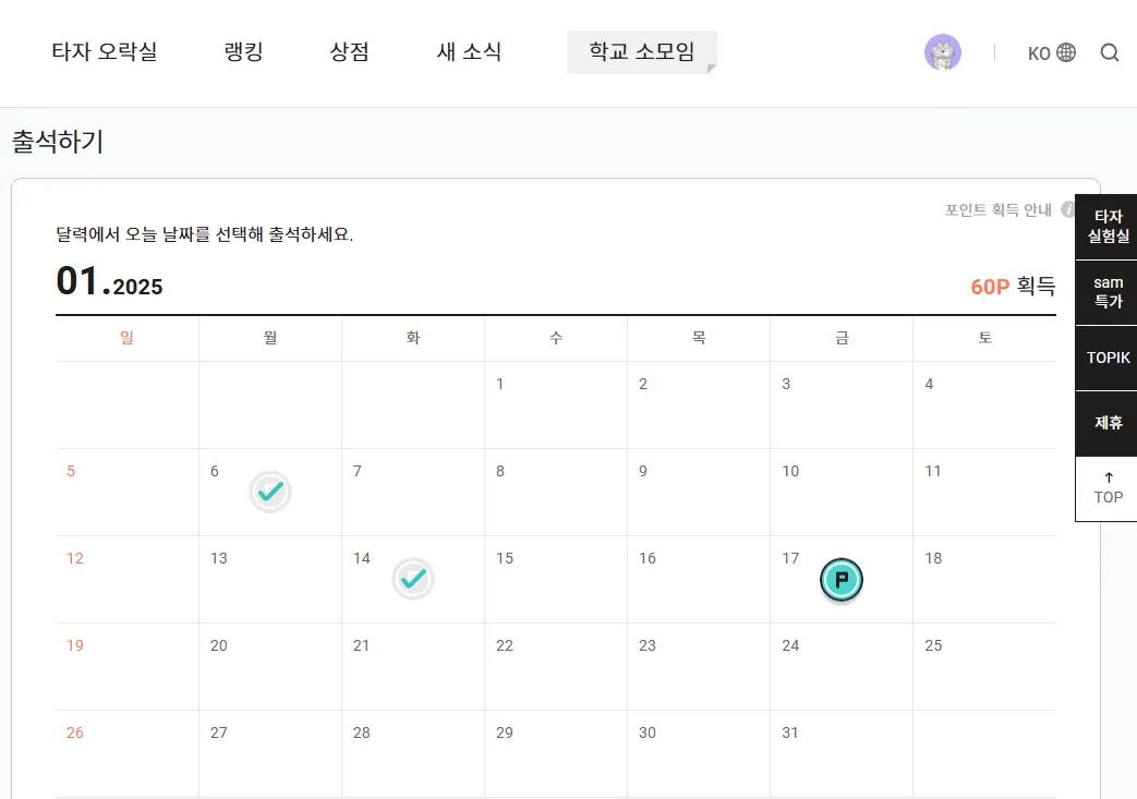 달력에서 ℗를 클릭해야 출석이 되고 포인트도 얻을 수 있어요. 연속일 중간에 결석한 경우 보충할 수 있는 방법이 있으니 출석 화면에서 확인해 봐요.