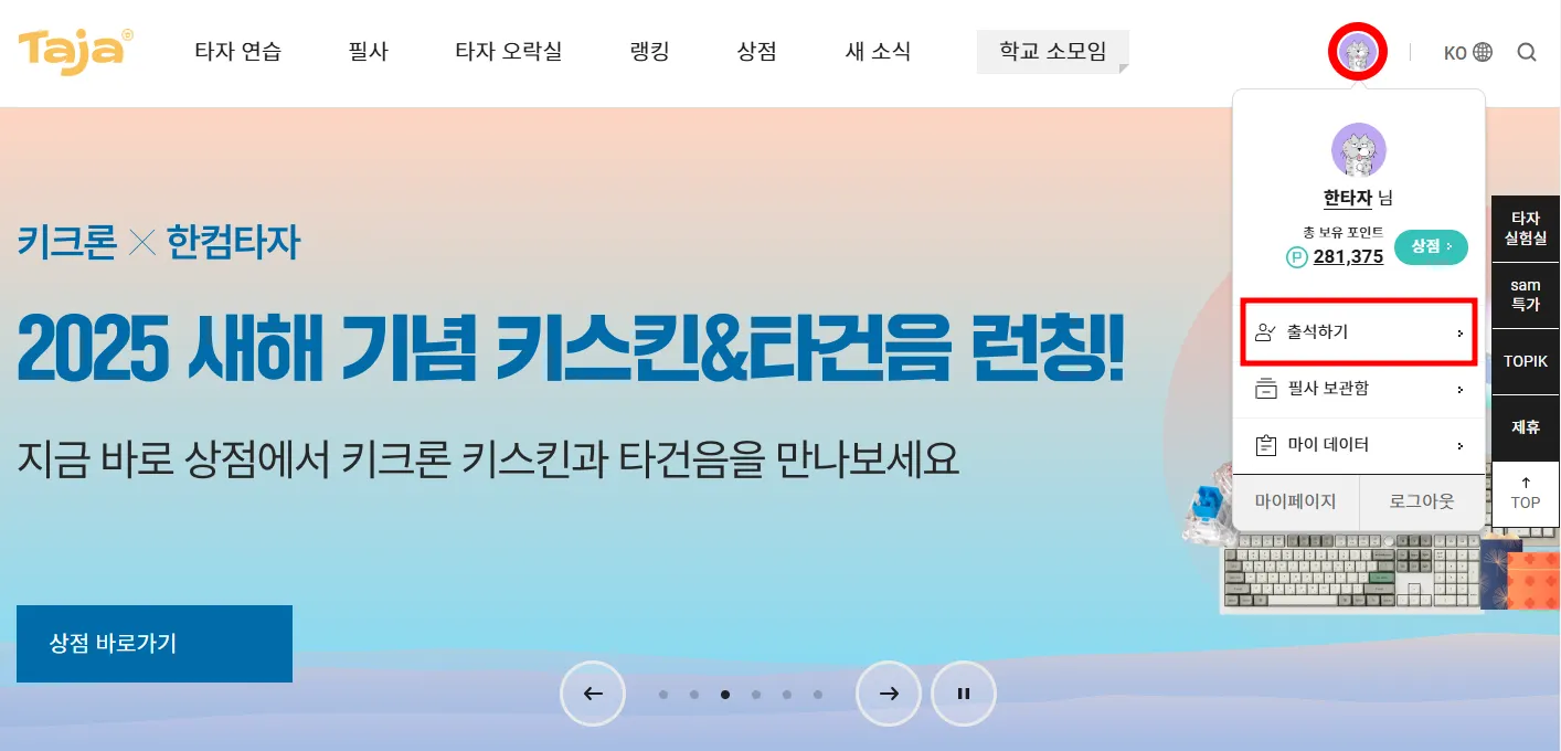 한컴타자 연속 10일 출석을 3회 달성하는 목표 어때요? 핸드폰으로도 출석할 수 있어요. 또 모바일로 산성비 게임도 할 수 있으니 한컴타자에서 기분도 전환하세요!