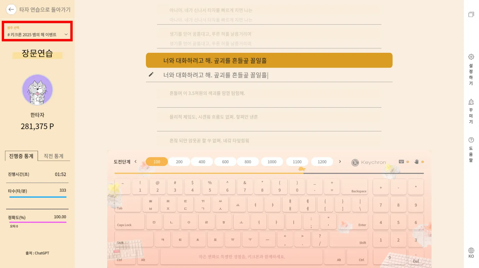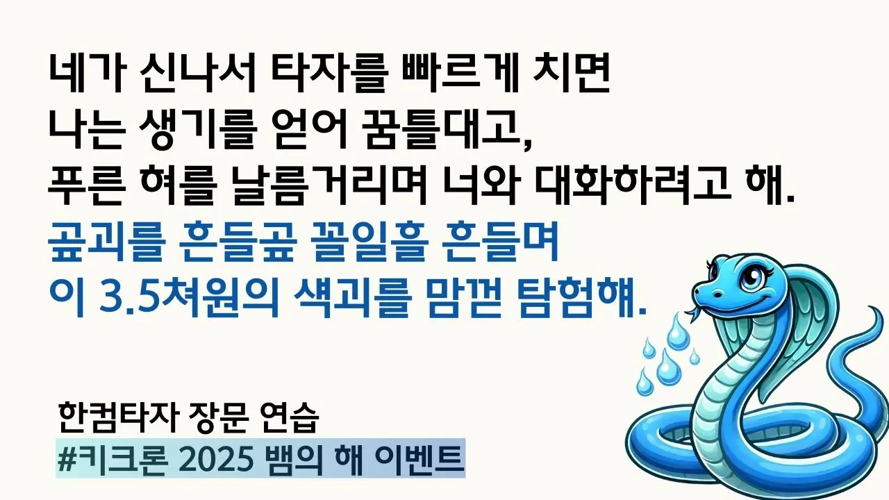 타자 연습 > 장문 연습에서 범주를 ‘#키크론 2025 뱀의 해 이벤트’로 선택해 주세요.