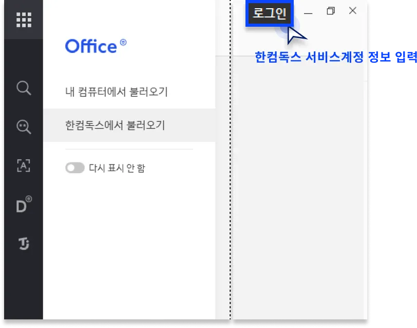 바탕화면 아이콘에서 사용하고자하는 한컴오피스를 선택한 후, 한컴독스 계정 정보를 입력하여 사용합니다.