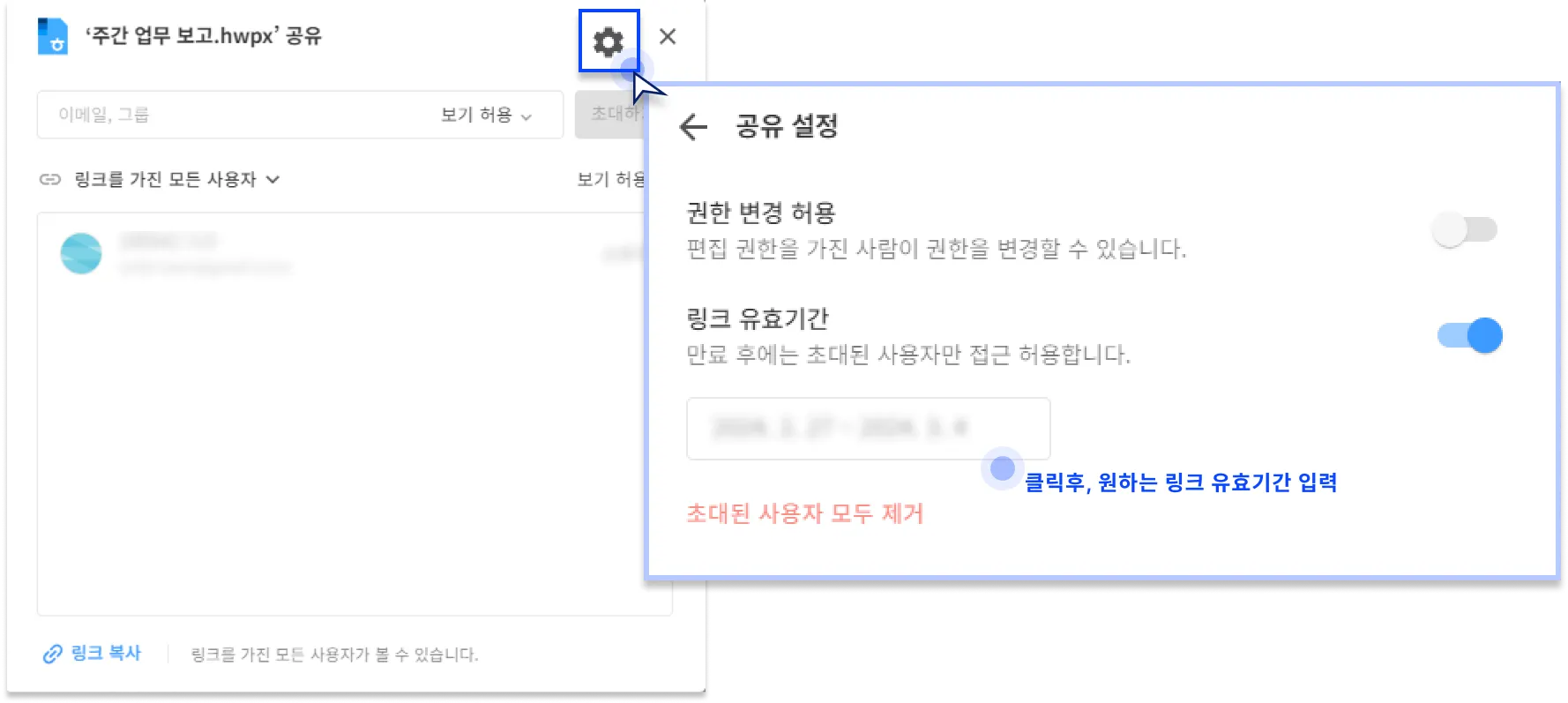 톱니바퀴를 누르면 링크 유효기간을 설정할 수 있습니다. 유효기간은 일자별로 설정 가능합니다.