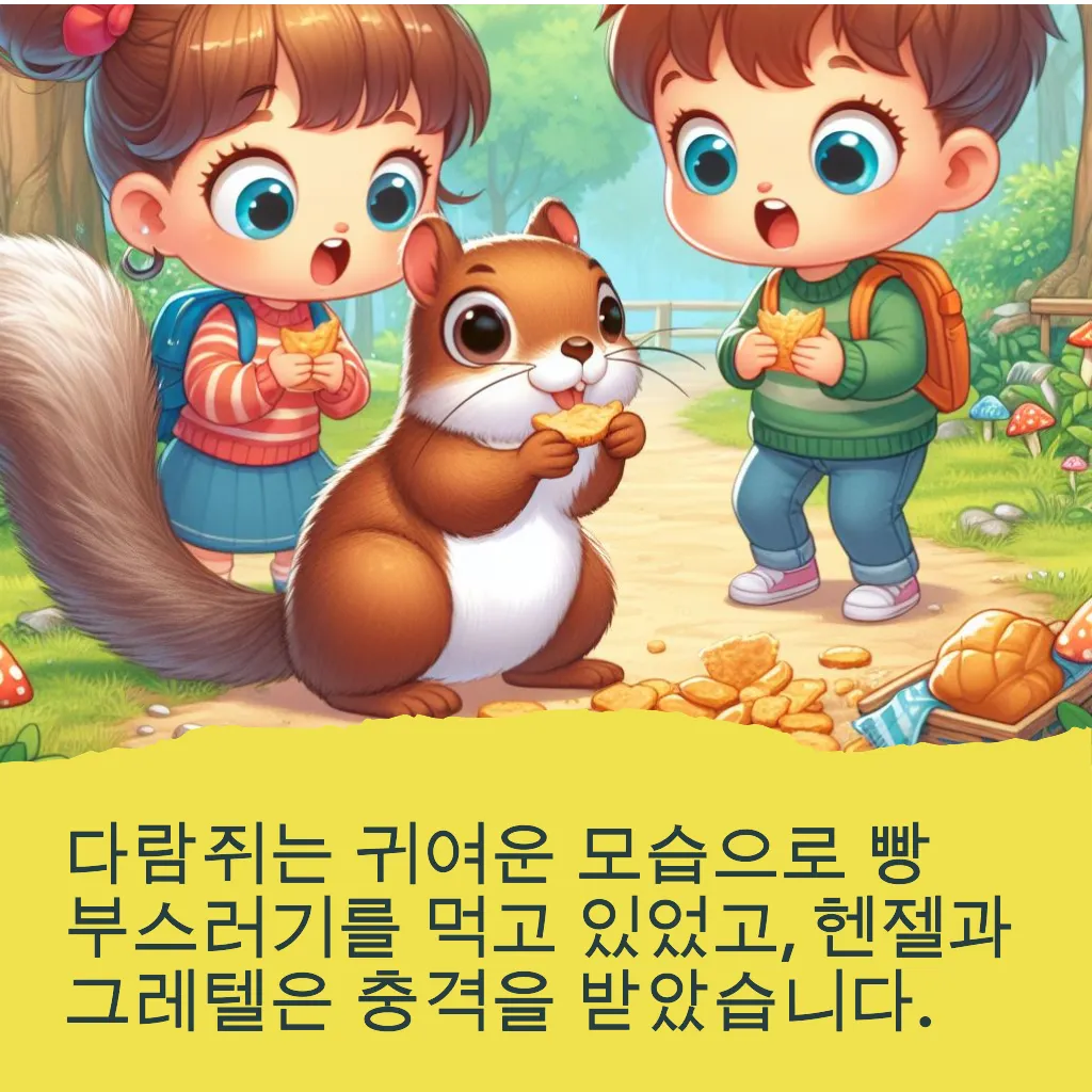 헨젤과 그레텔이 숲 속에서 길을 잃고 방황하던 중, 그들은 배고픔을 느꼈습니다. 하지만 그들은 빵 조각들을 따라가며 다람쥐를 만났습니다. 다람쥐는 귀여운 모습으로 빵 부스러기를 먹고 있었고, 헨젤과 그레텔은 충격을 받았습니다.