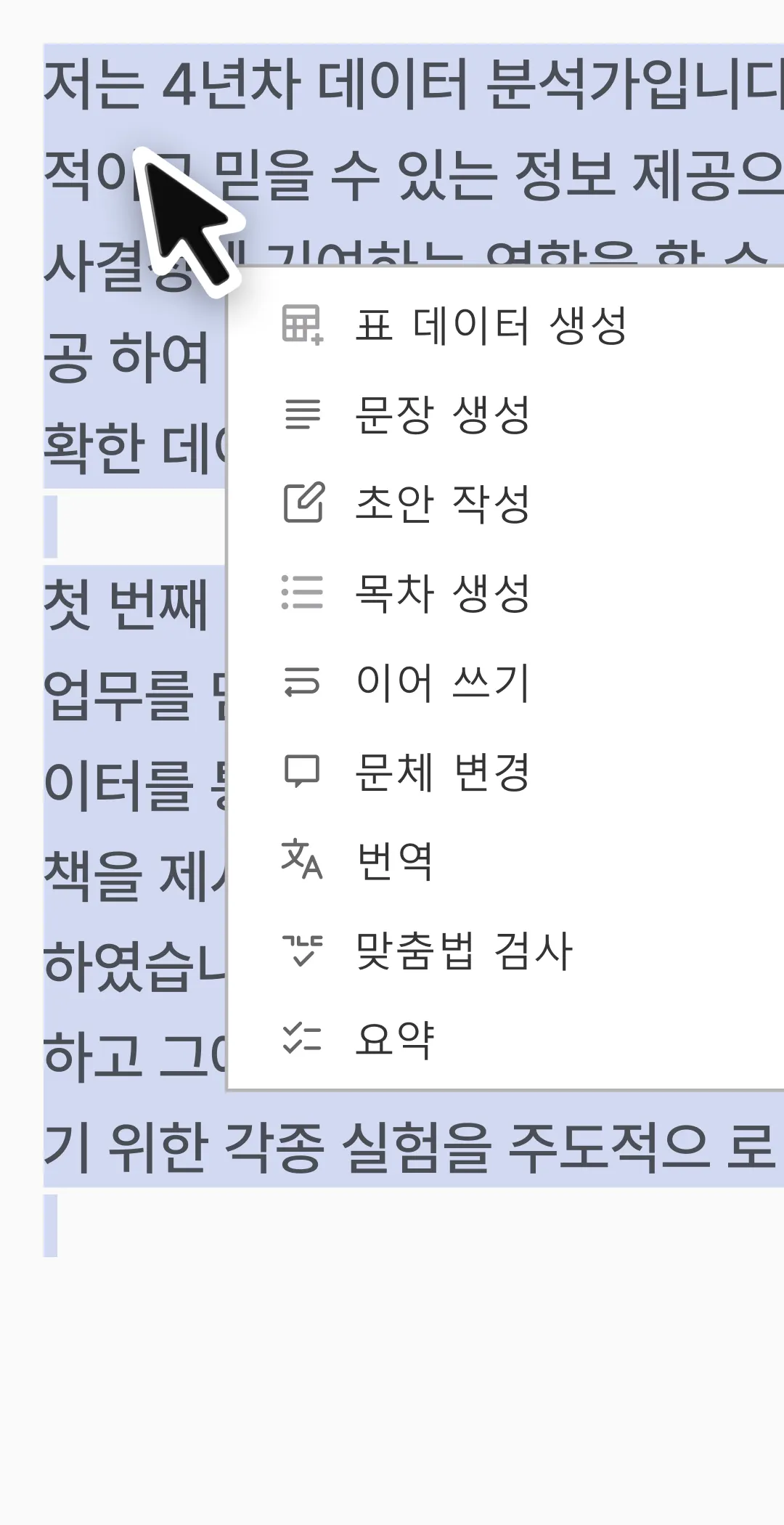 이어 쓰기 : 현재까지 작성된 문장을 분석하여 문맥에 맞는 이후 문장을 생성하는 기능