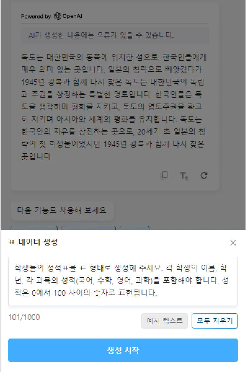 아래의 순서를 통해 표 데이터 만들기 기능을 사용할 수 있습니다.