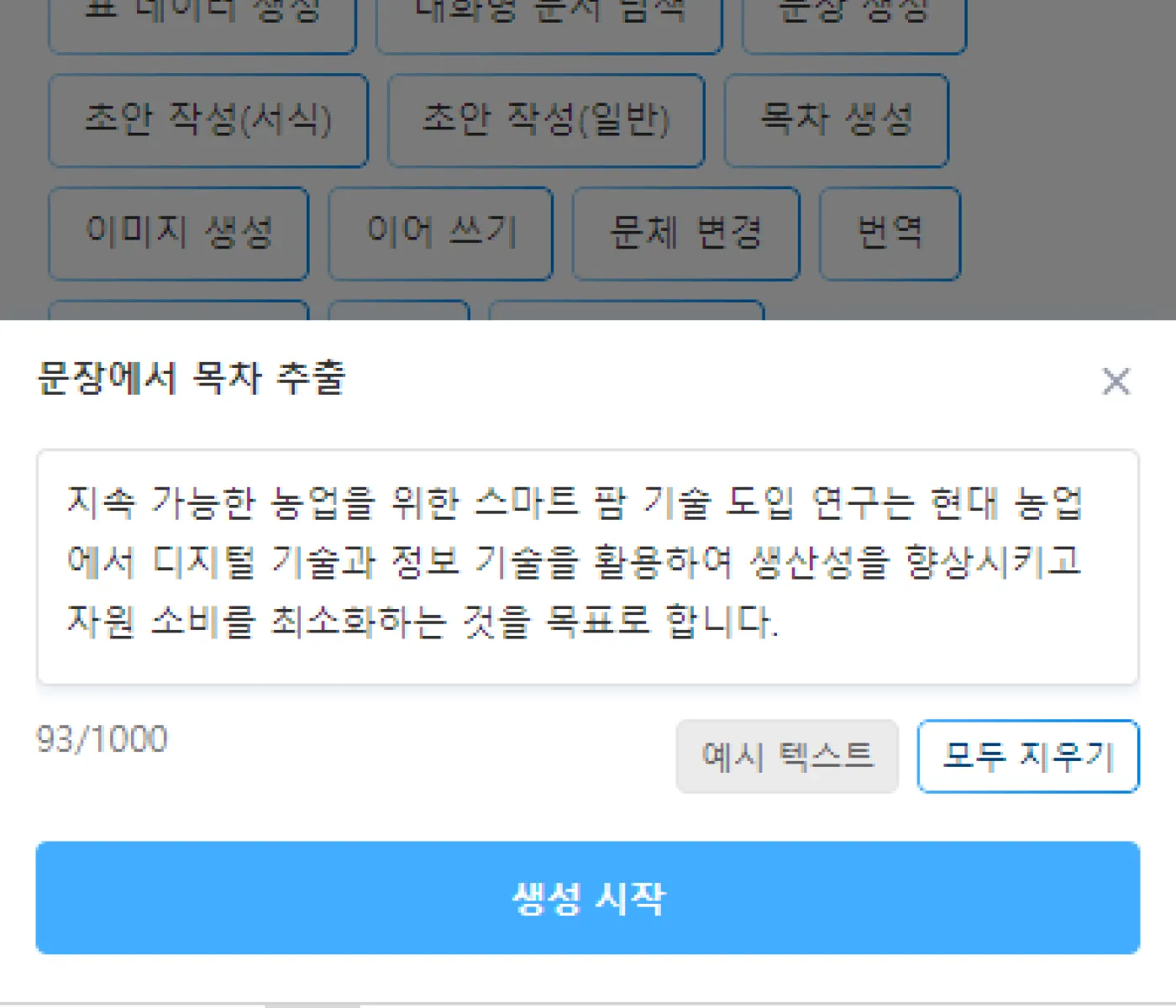 1,000자 이내 문장을 작성해서 바로 목차를 추출할 수 있습니다.