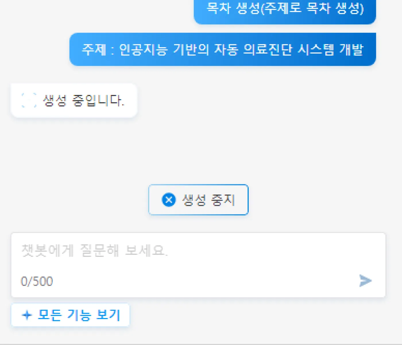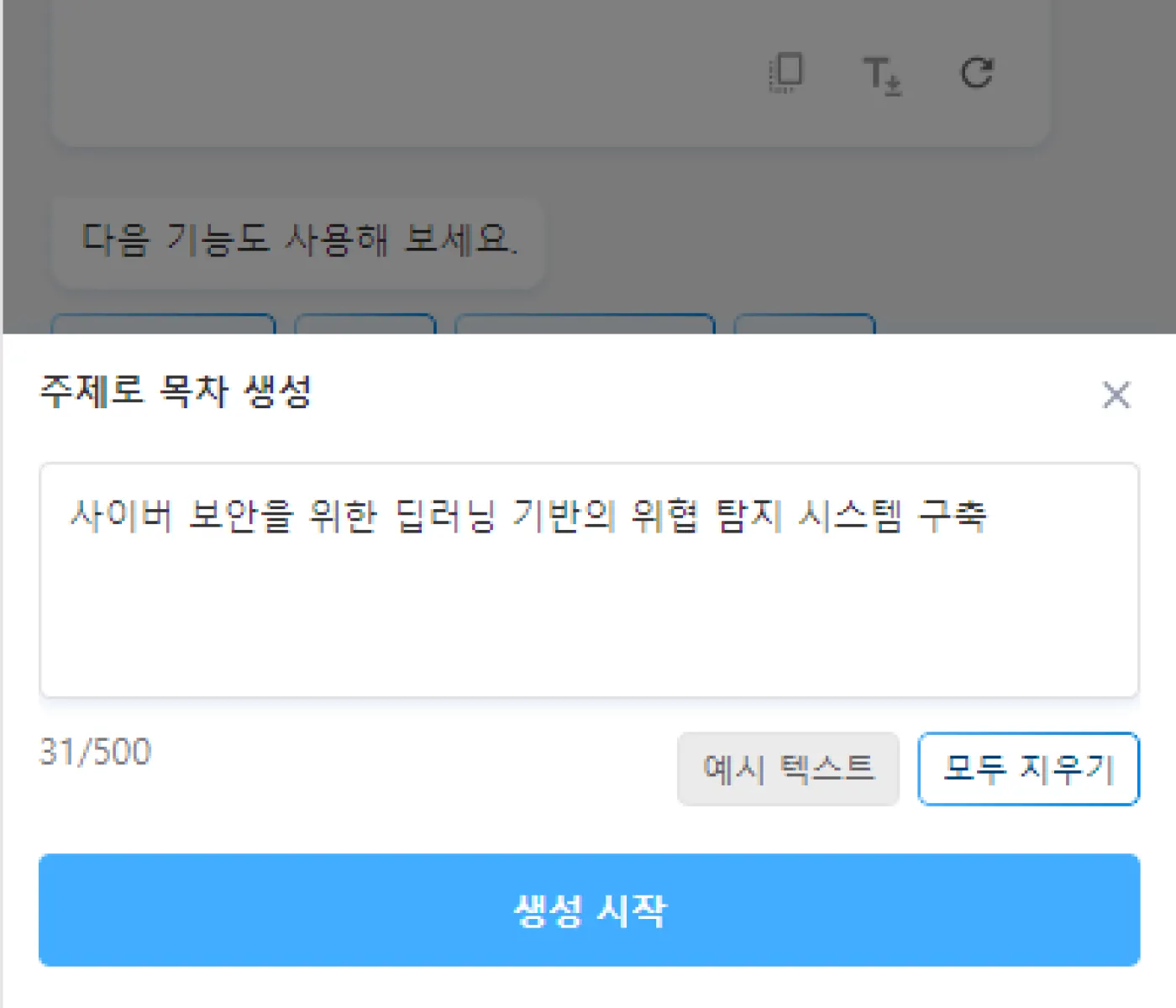 목차 생성 시, 원하는 주제를 입력하면 자동으로 목차를 생성합니다.