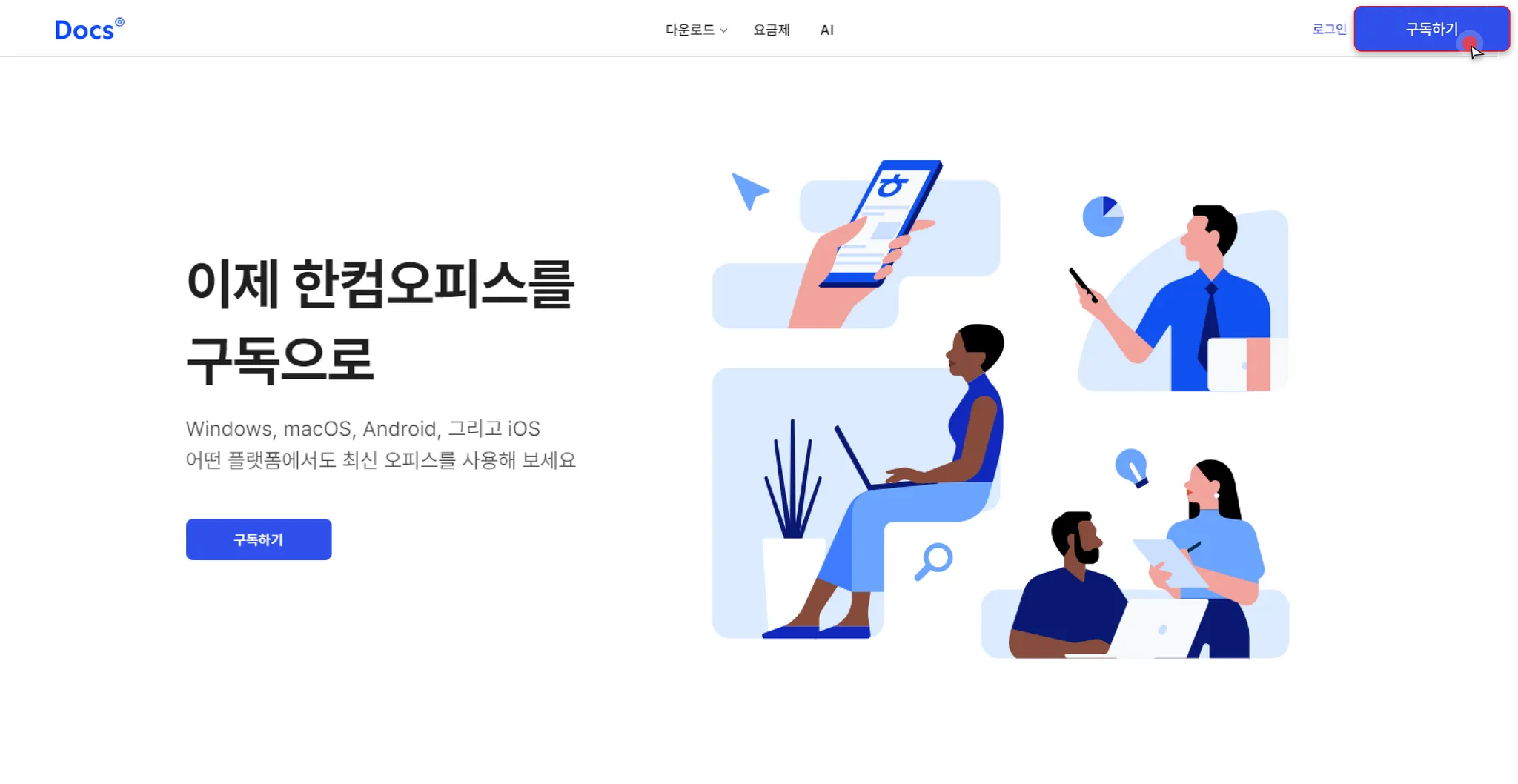 한컴독스 메인 페이지 우측 상단 구독하기 버튼을 클릭한다.