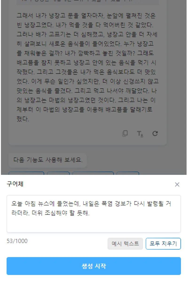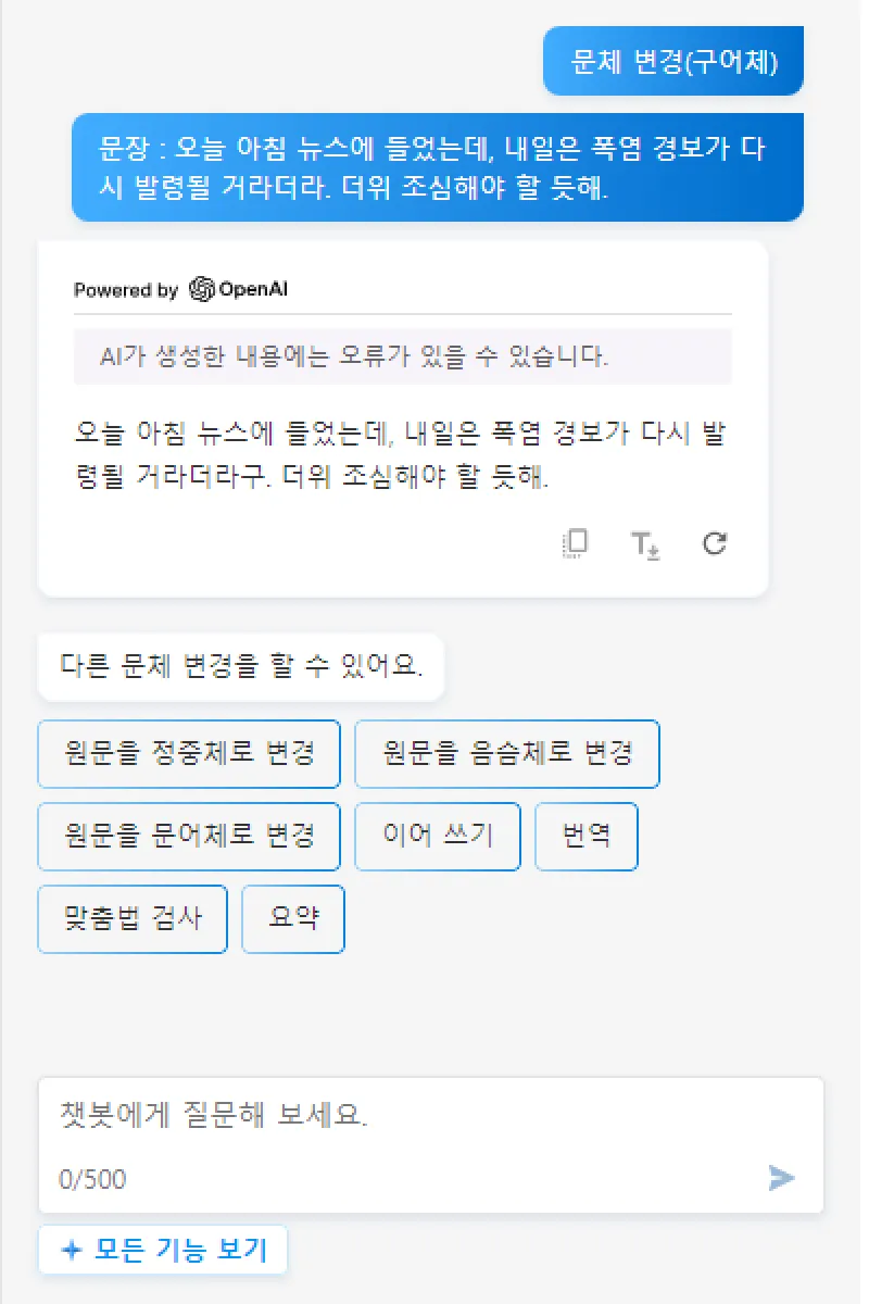 특정 문장을 원하는 문체로 변경 가능합니다.