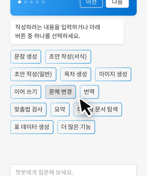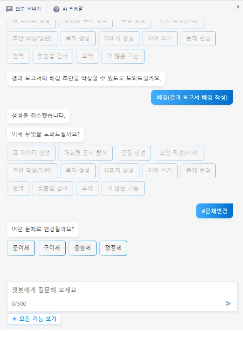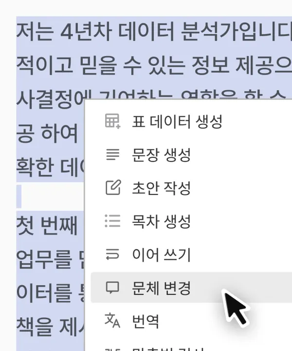 아래 3가지 방법으로 한컴독스 AI를 이용해 문체 변경 기능을 이용할 수 있습니다.