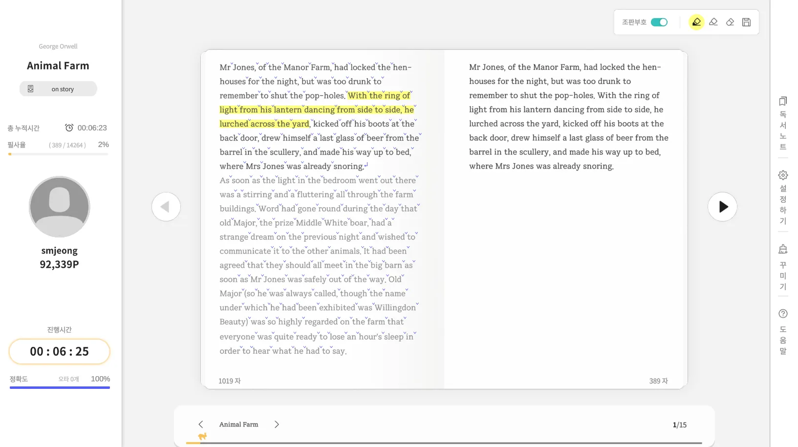 동물농장을 원어로 타이핑하면서 영어 문법 구조에 익숙해지고, 상황이나 동작에 대한 묘사를 영어로 어떻게 하는지 천천히 파악해 보세요. 한컴타자에서 여러 번 필사하고 작품에 취해 보는 건 어떨까요~