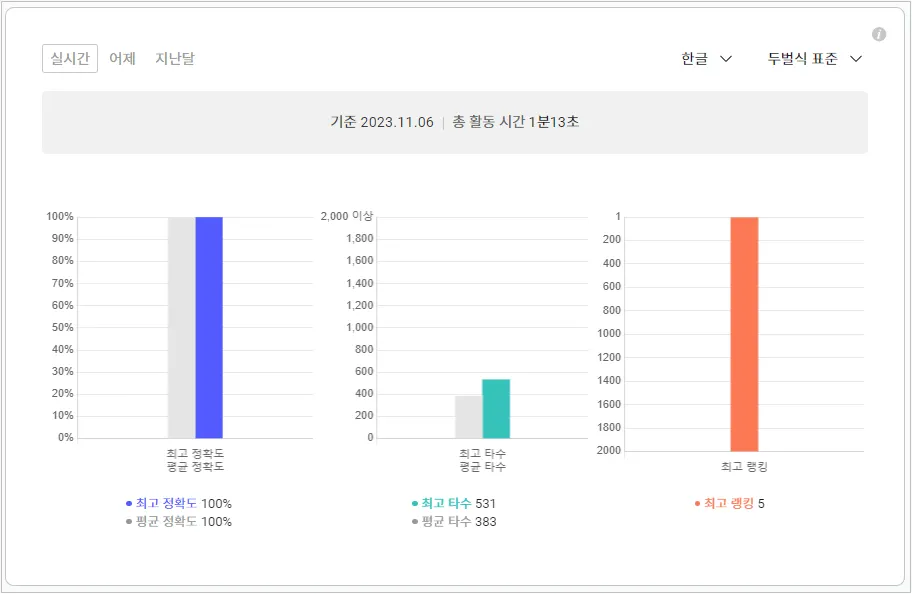 [연습]을 통해 정확도와 타수, 랭킹 등을 확인할 수 있습니다.