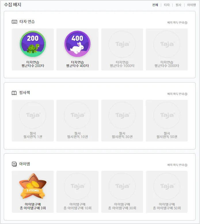 [마이페이지] > [내 활동]에서 [수집 배지] 클릭하면 아래와 같이 내가 한컴타자에서 수집한 여러 도전 과제(배지)를 확인할 수 있습니다.