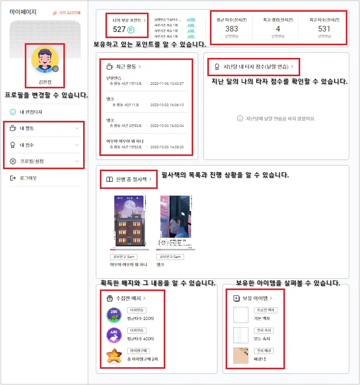 [타자 활동]에서는 ‘자리 연습’, ‘낱말 연습’, ‘단문 연습’, ‘장문 연습’, ‘타자검정’, ‘받아쓰기’ 각각에 대한 타수 및 정확도 등을 알 수 있습니다.