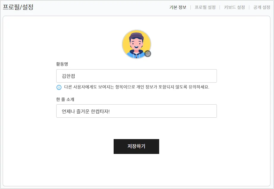 [기본 정보]를 통해 나의 활동 명과 한 줄 소개를 수정할 수 있습니다.