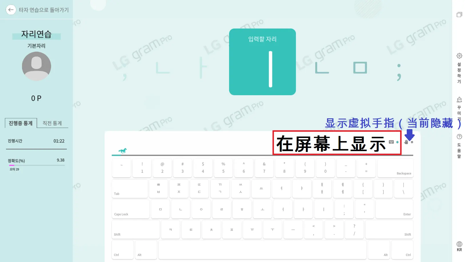 如果您是键盘新手,可以用每只手或按键盘上按键的位置进行练习。屏幕显示虚拟键盘和虚拟手指