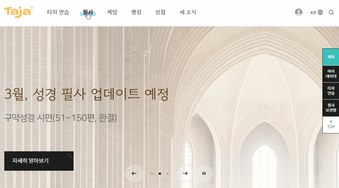한컴타자의 상단 메뉴에서 [필사] 선택한 다음 화면에서 ‘종교’를 선택하고 필사할 시편을 구매하세요. 구약성경 콘텐츠는 정기적으로 추가돼요. 하나님의 은혜와 사랑이 깃든 성경을 한 글자씩 필사해 보세요!