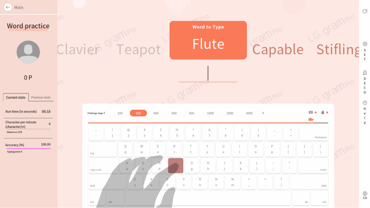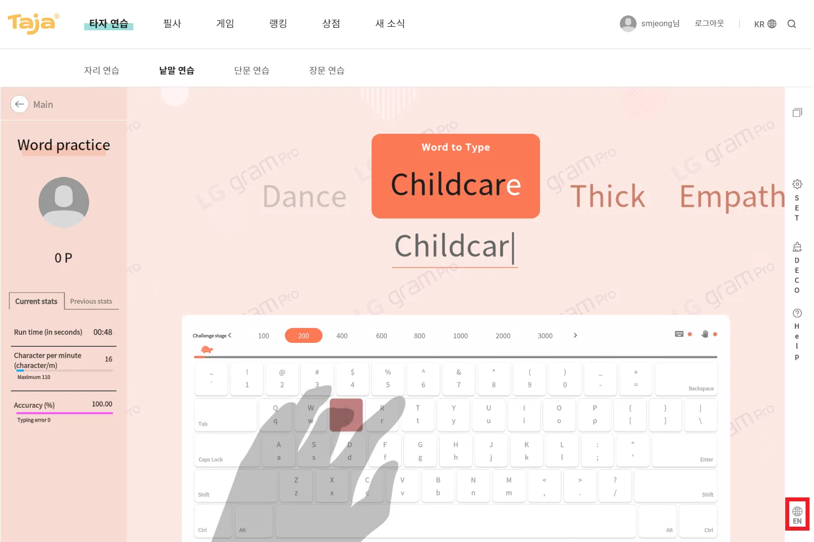 낱말 연습을 끝내고 다시 도전하면 다른 카테고리의 단어가 나와요. 여러 번 도전해서 속도, 정확도, 영어 단어까지 끌어올려보아요~