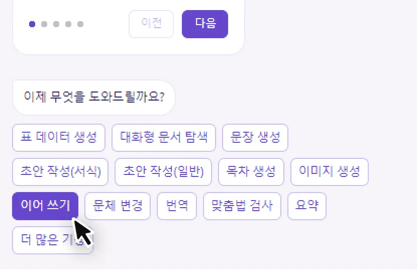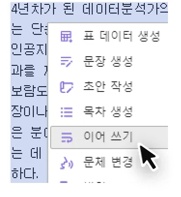 아래 3가지 방법으로 한컴독스 AI를 이용해 이어 쓰기 기능을 이용할 수 있습니다.