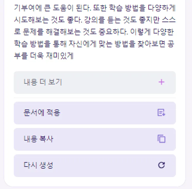 생성된 문장에 대해 문서에 적용/내용 복사/다시 생성하기가 가능합니다.