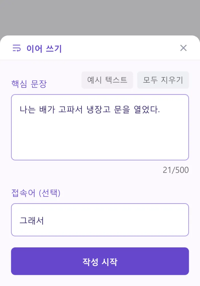 입력한 핵심 문장을 기준으로 이어 쓰기 문장이 작성되며, 입력하고자 하는 접속어를 입력하여 이어 쓰기가 가능합니다.