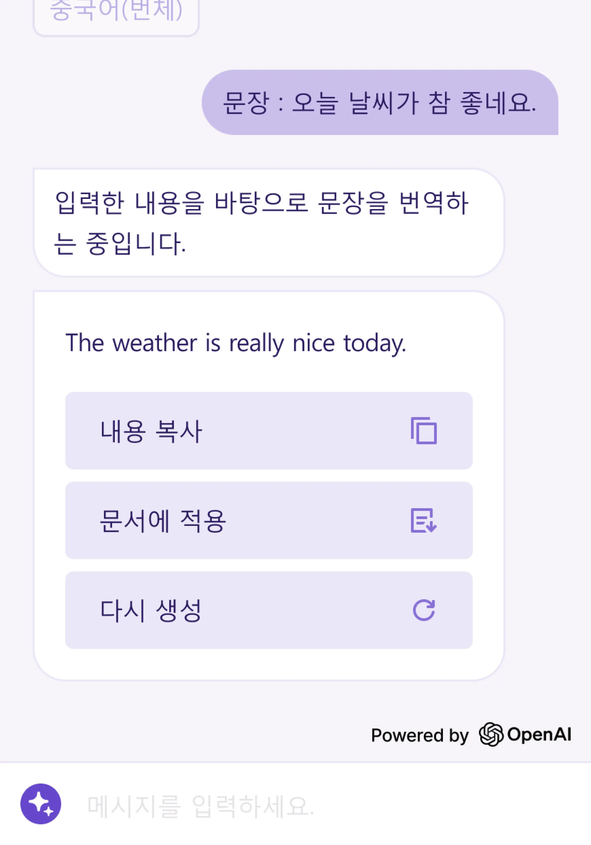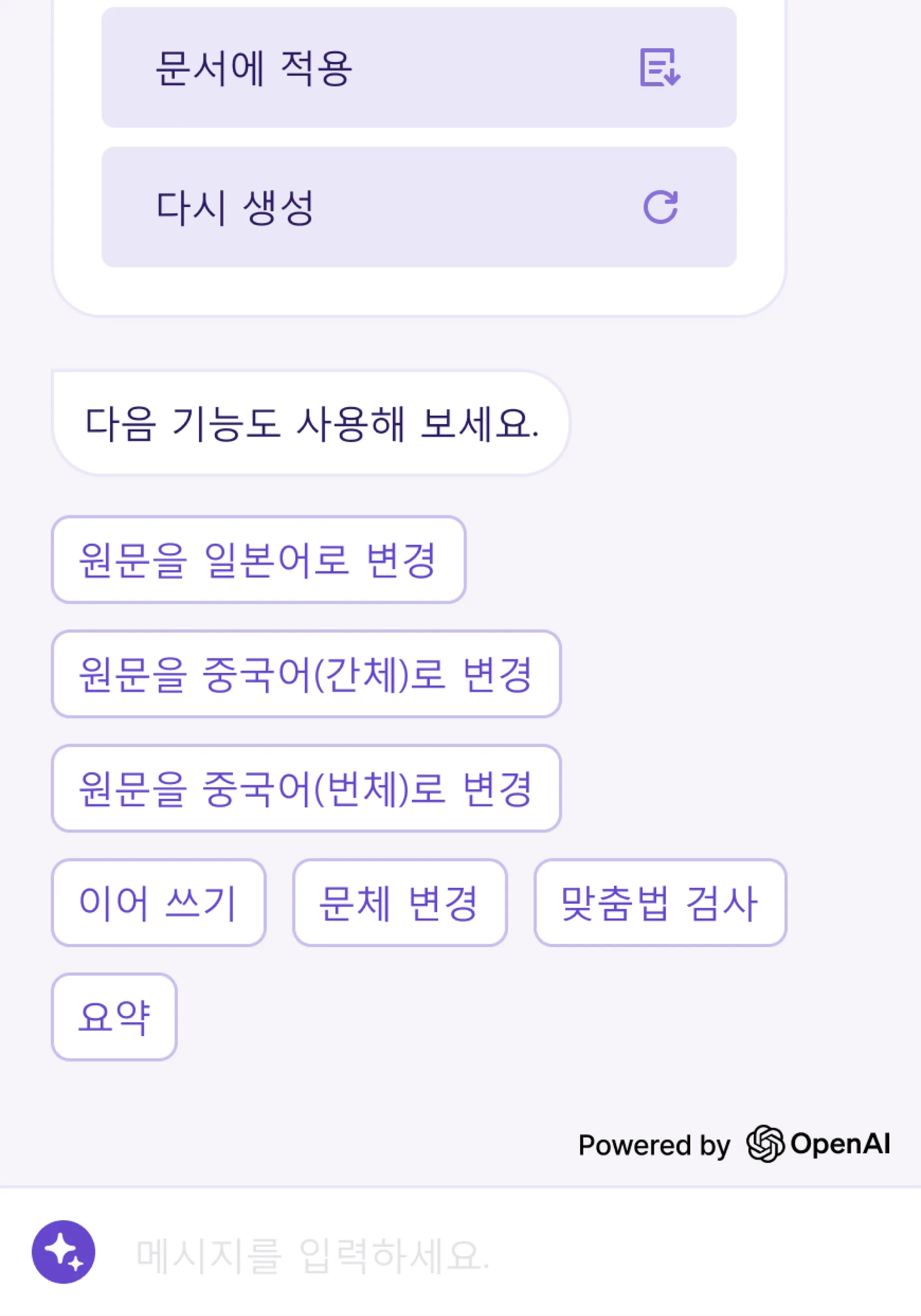생성된 문장에 대해 문서에 적용/내용 복사/다시 생성하기가 가능합니다.
