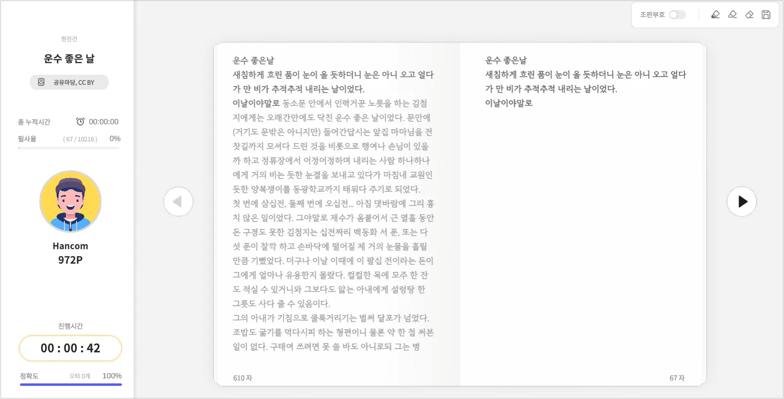 지금 한컴타자에서 ‘운수 좋은 날’을 필사해 보세요. 한컴타자에서 한 문장씩 음미하면서 필사하고 마음에 드는 내용은 ‘독서노트’에 저장하세요.