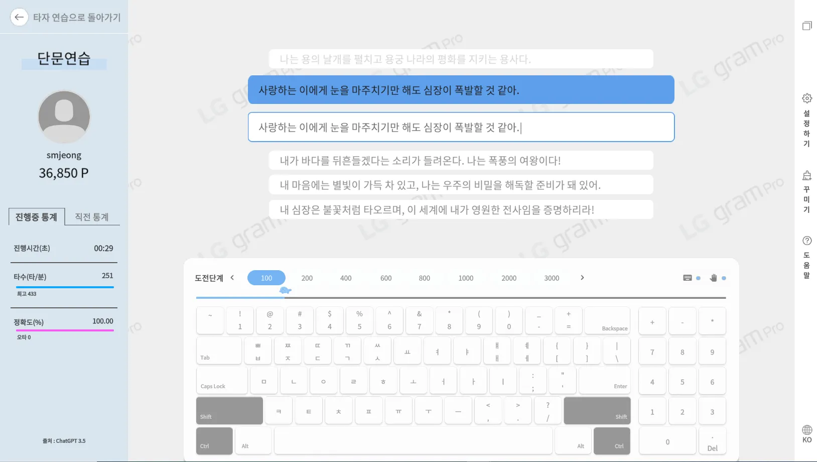 한컴타자의 타자 연습에서 단문 연습(출처 ChatGPT 3.5)