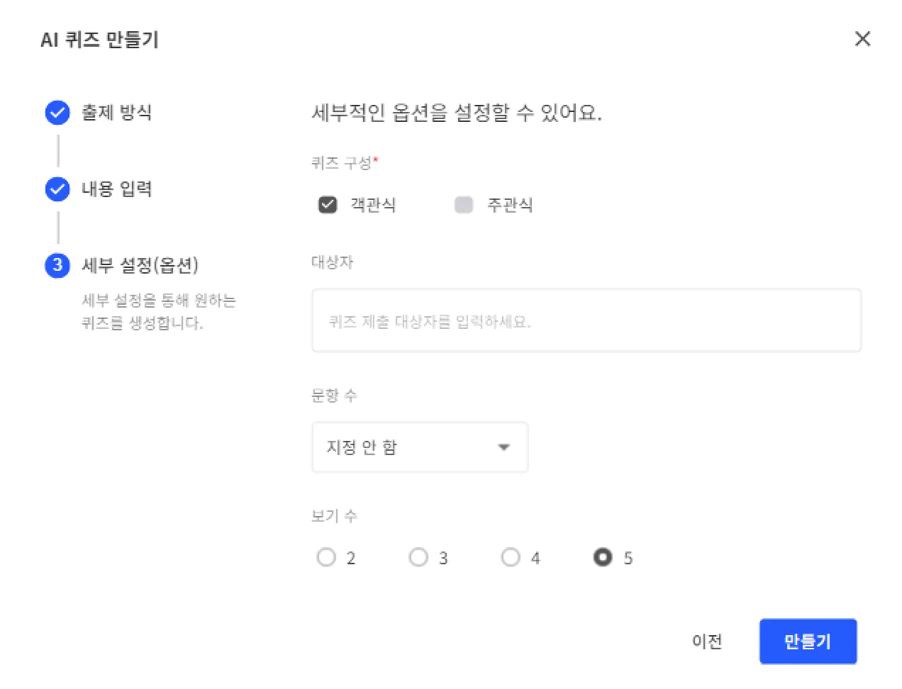 퀴즈 구성, 대상자, 문항 수, 보기 수 등 세부 설정을 통해 더욱 최적화된 퀴즈를 생성할 수 있어요.