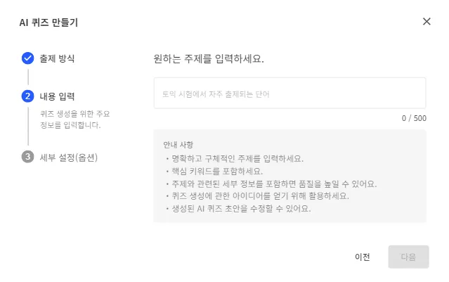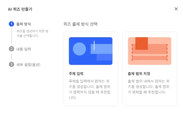 퀴즈 출제 범위가 명확하지 않을 때는 주제 입력을 선택하세요. 입력한 주제를 통해 퀴즈를 생성합니다.