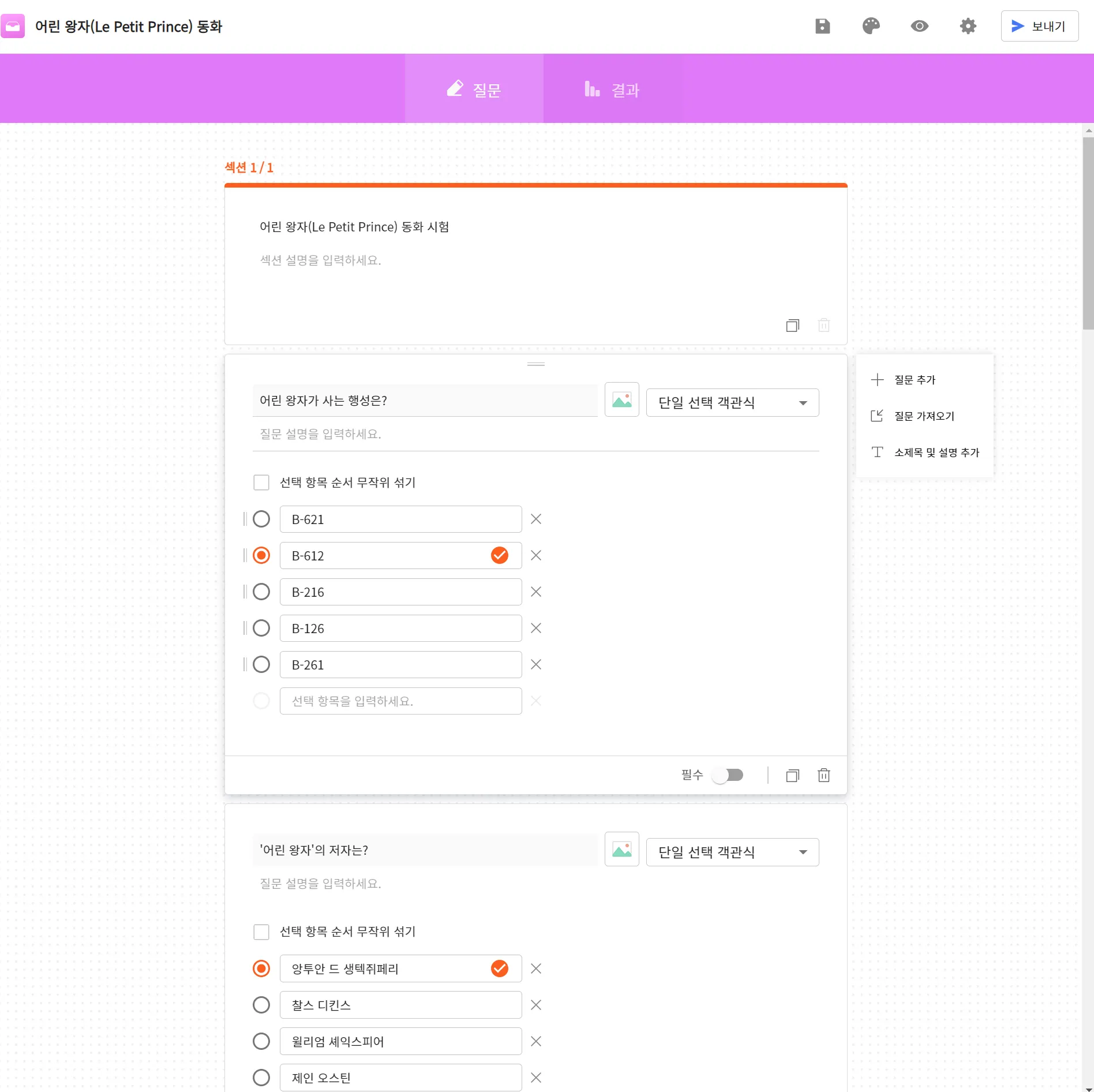문서명, 섹션 제목, 질문, 보기, 답변을 자동으로 생성됩니다.