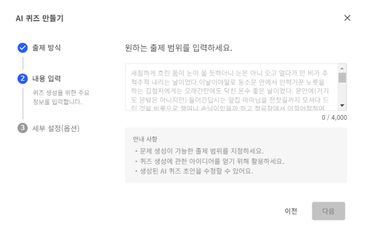 선택한 퀴즈 출제 방식에 적합한 내용을 입력하세요. 주제는 500자 이내, 출제 범위 지정은 4,000자 이내로 입력할 수 있어요.