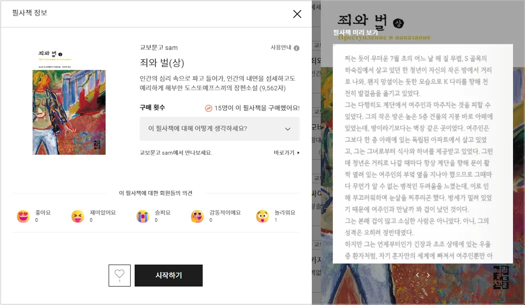 [필사] 메뉴에서 원하는 책을 선택하면 위와 같이 안내 화면이 팝업 됩니다.