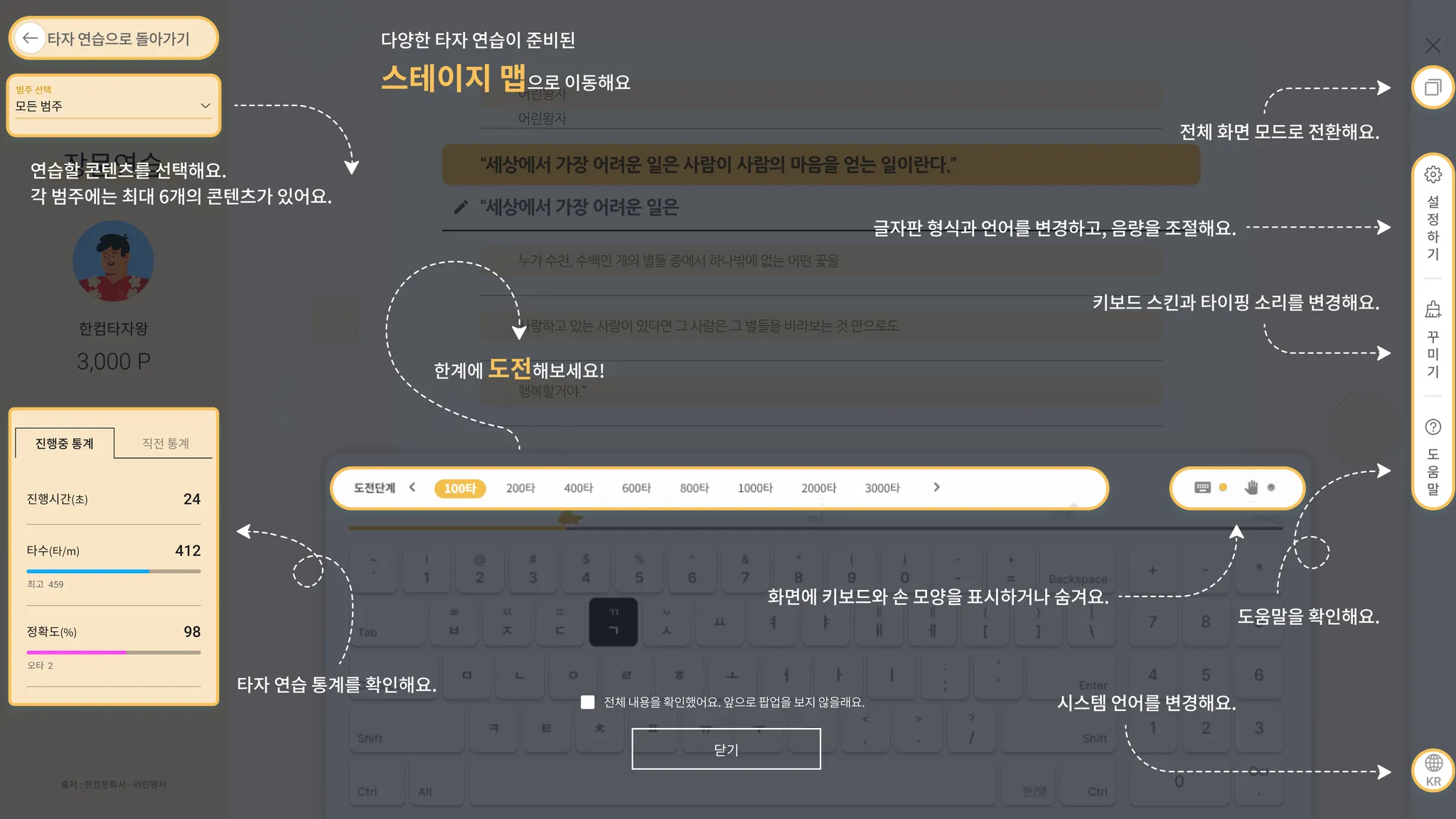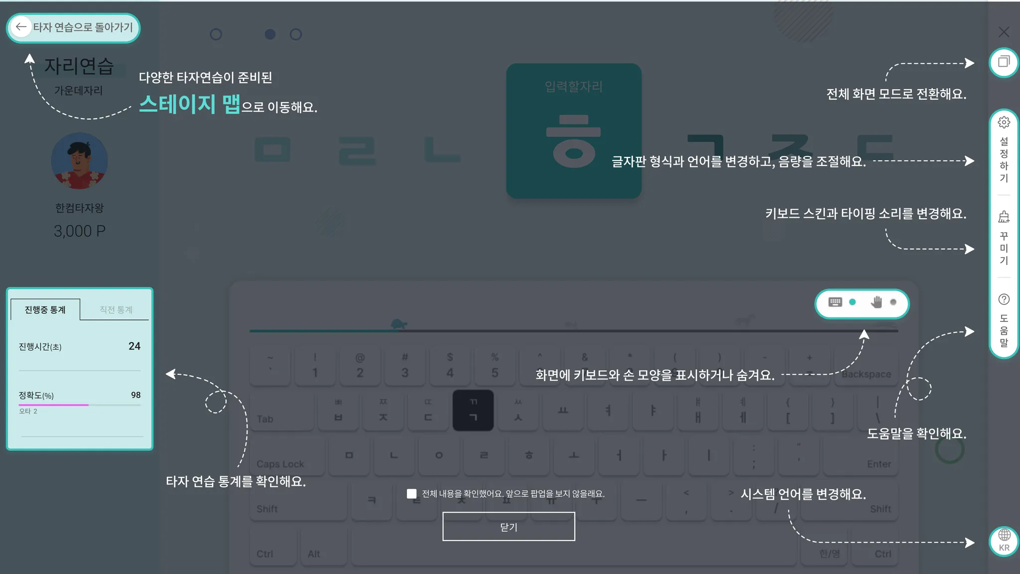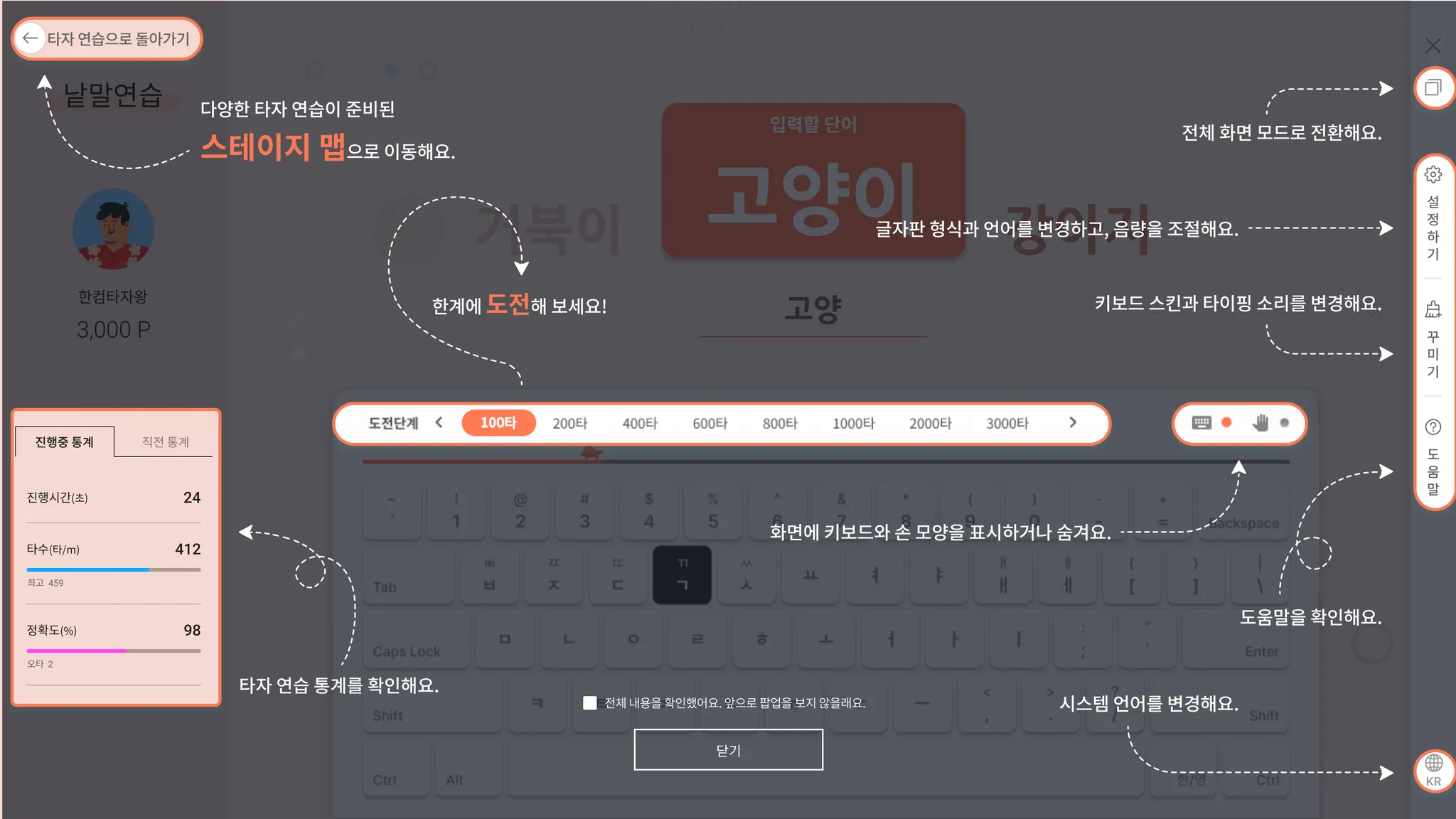한컴타자의 ‘타자 연습’에서 자리, 낱말, 단문, 장문 연습을 즐기실 수 있습니다.
