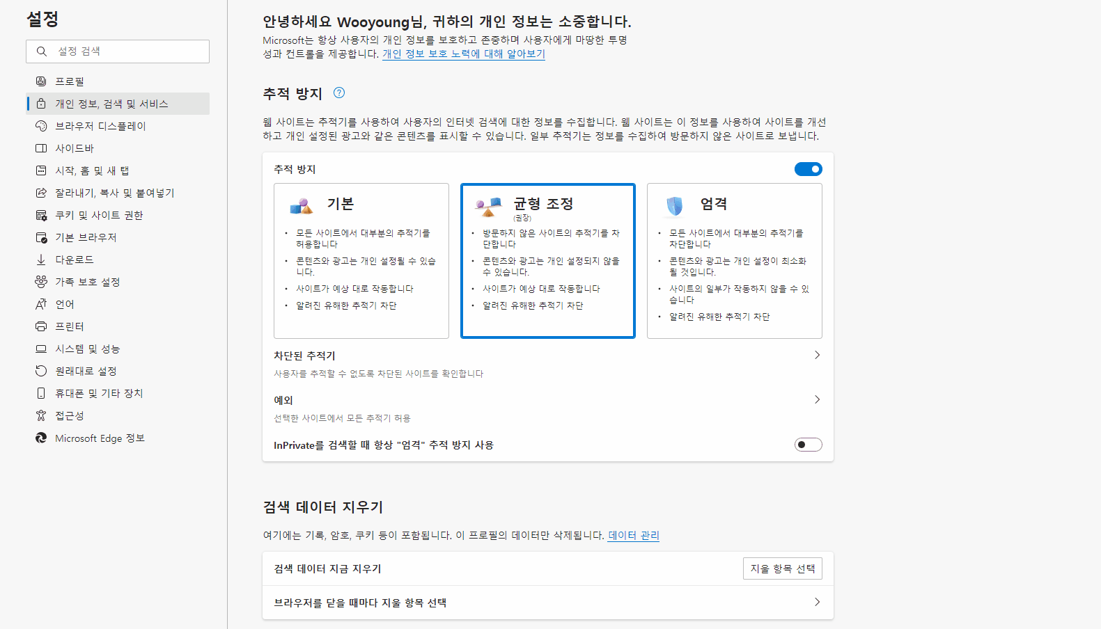좌측 메뉴에서 ‘개인 정보, 검색 및 서비스’를 클릭한 후, 하단 ‘검색 데이터 지금 지우기’의 ‘지울 항목 선택’ 클릭